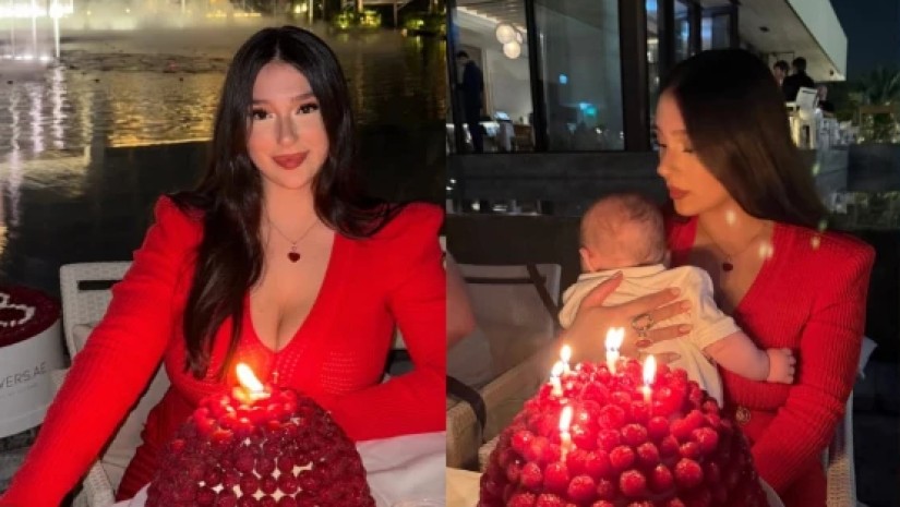 ლიზას შესანიშნავი წითელი კაბა აცვია და თავის უსაყვარლეს შვილთან ერთად, ორიგინალური ტორტის ფონზე პოზირებს. „დაბადების დღეს გილოცავთ, მუდამ ასე ანათე და იკაშკაშე, ულამაზესი ხარ“.