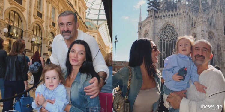 მოდელი ისტორიული შენობების ფონზე პოზირებს, მასთან ერთად იმყოფება მისი რჩეული დავით კოდუა და მათი პატარა ქალიშვილი.
