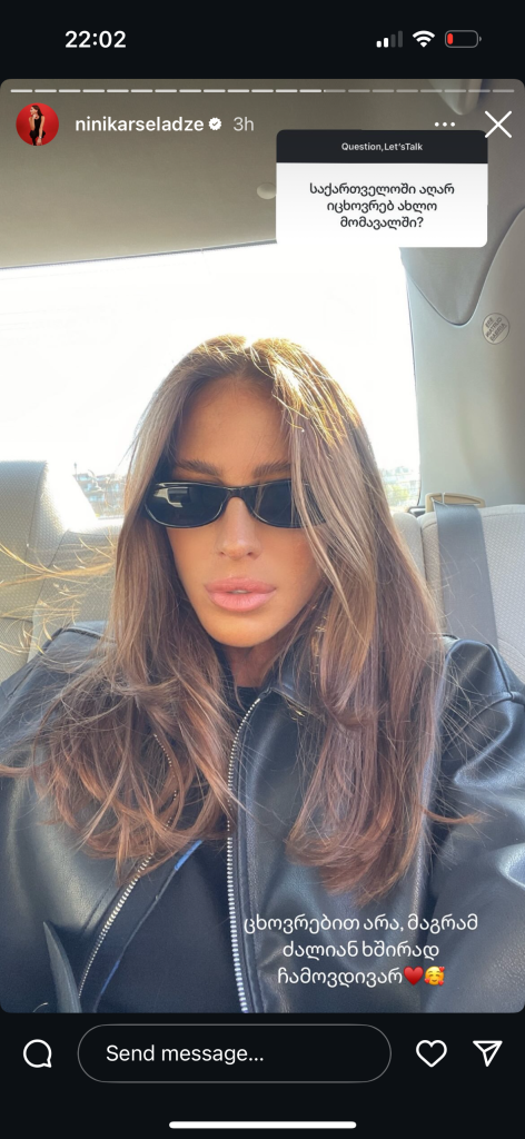 ნინი ქარსელაძე: „საქართველოში აღარ ვცხოვრობ.. მაგრამ ხშირად ჩამოვდივარ“ სლაიდერისოც.ქსელები By editor გამოქვეყნდა 17.06.2025 183 გაზიარება მომღერალმა ნინი ქარსელაძემ გამომწერების კითხვებს უპასუხა და განაცხადა, რომ საქართველოში აღარ ცხოვრობს, თუმცა ხშირად ჩამოდის სამშობლოში. 183 გაზიარება