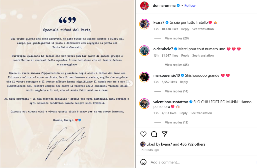 Instagram-ზე გავრცელებულ მის პოსტს არაერთი პსჟ-ის ფეხბურთელი გამოეხმაურა და რა თქმა უნდა, გამონაკლისი არც ხვიჩა კვარაცხელია გახლდათ, რომელსაც დონარუმასთან ძალიან კარგი ურთიერთობა აკავშირებს.