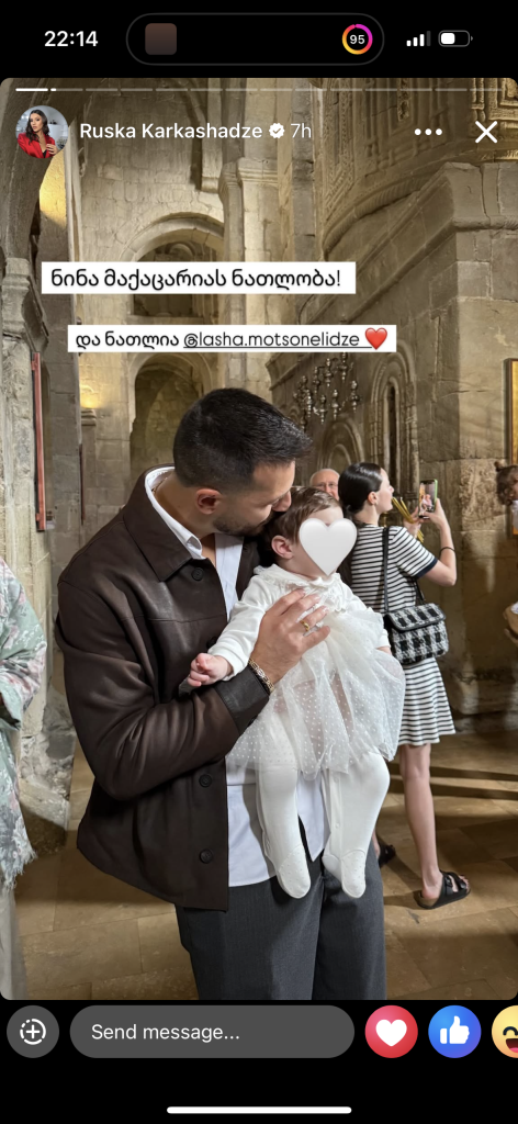 ირაკლი მაქაცარია რუსკა ქარქაშაძეს დაუნათესავდა სლაიდერისოც.ქსელები By editor გამოქვეყნდა 10.09.2025 163 გაზიარება ირაკლი მაქაცარიას და ლიზა ჩიჩუას მეორე შვილი ნინა მაქაცარია გაქრისტიანდა. ინფორმაციას ამის შესახებ რუსკა ქარქაშაძე ავრცელებს. რუსკას სთორებიდან გაირკვა რომ წყვილის მეორე შვილი რუსკას მეუღლემ ლაშა მოწონელიძემ მონათლა. 163 გაზიარება