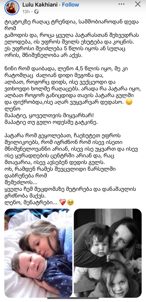 ლულუ კახიანი რომლის ქალიშვილიც რამდენიმე წლის წინ ტრაგიკულად დაიღუპა ემოციურ მიმართვას ავრცელებს.