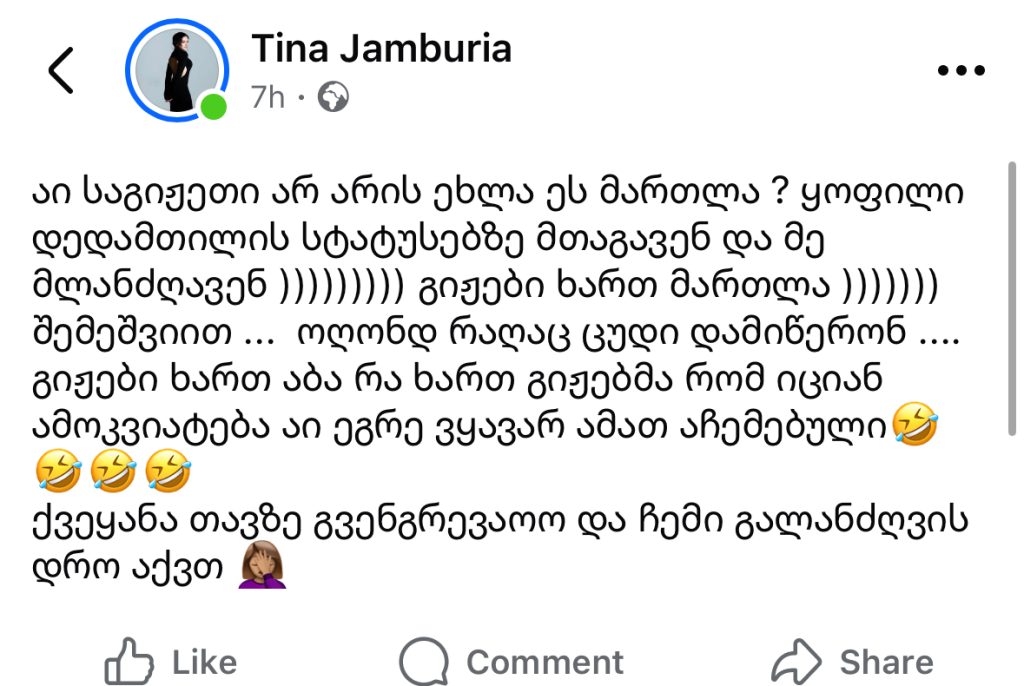 თიკა ჯამბურია სოციალურ ქსელში პოსტს აქვეყნებს.