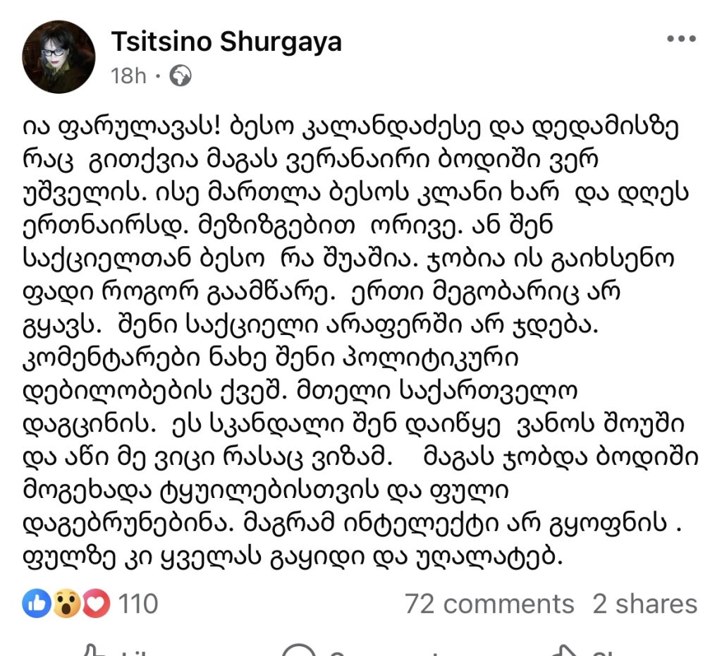 მთელი საქართველო დაგცინის. ეს სკანდალი შენ დაიწყე ვანოს შოუში და აწი მე ვიცი რასაც ვიზამ. მაგას ჯობდა ბოდიში მოგეხადა ტყუილებისთვის და ფული დაგებრუნებინა. მაგრამ ინტელექტი არ გყოფნის. ფულზე კი ყველას გაყიდი და უღალატებ“, – წერს ციცინო შურღაია