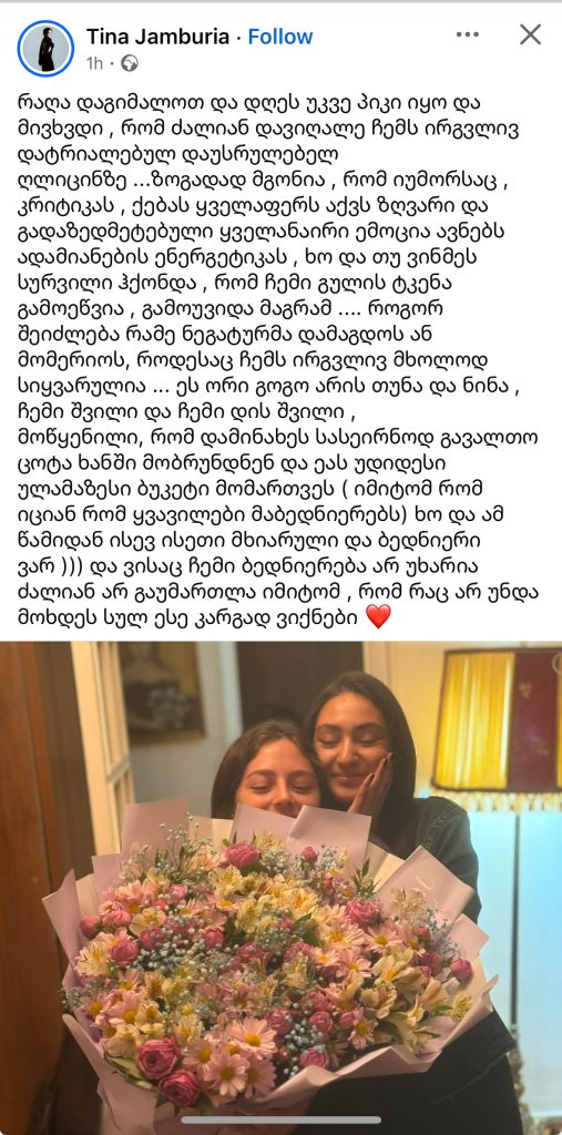 ”რაღა დაგიმალოთ და დღეს უკვე პიკი იყო და მივხვდი , რომ ძალიან დავიღალე ჩემს ირგვლივ დატრიალებულ დაუსრულებელ ღლიცინზე …ზოგადად მგონია , რომ იუმორსაც , კრიტიკას , ქებას ყველაფერს აქვს ზღვარი და გადაზედმეტებული ყველანაირი ემოცია ავნებს ადამიანების ენერგეტიკას , ხო და თუ ვინმეს სურვილი ჰქონდა , რომ ჩემი გულის ტკენა გამოეწვია , გამოუვიდა მაგრამ …. როგორ შეიძლება რამე ნეგატურმა დამაგდოს ან მომერიოს, როდესაც ჩემს ირგვლივ მხოლოდ სიყვარულია … ეს ორი გოგო არის თუნა და ნინა , ჩემი შვილი და ჩემი დის შვილი ,