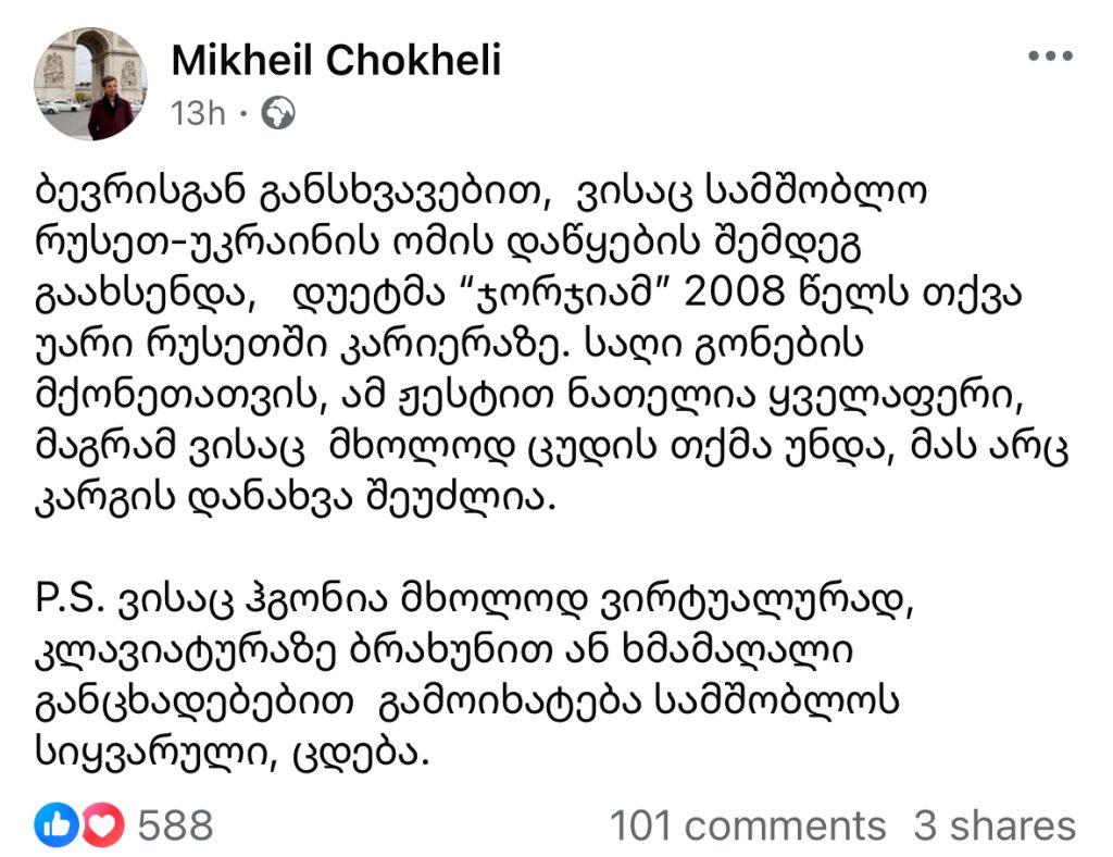 P.S. ვისაც ჰგონია მხოლოდ ვირტუალურად, კლავიატურაზე ბრახუნით ან ხმამაღალი განცხადებებით გამოიხატება სამშობლოს სიყვარული, ცდება.”