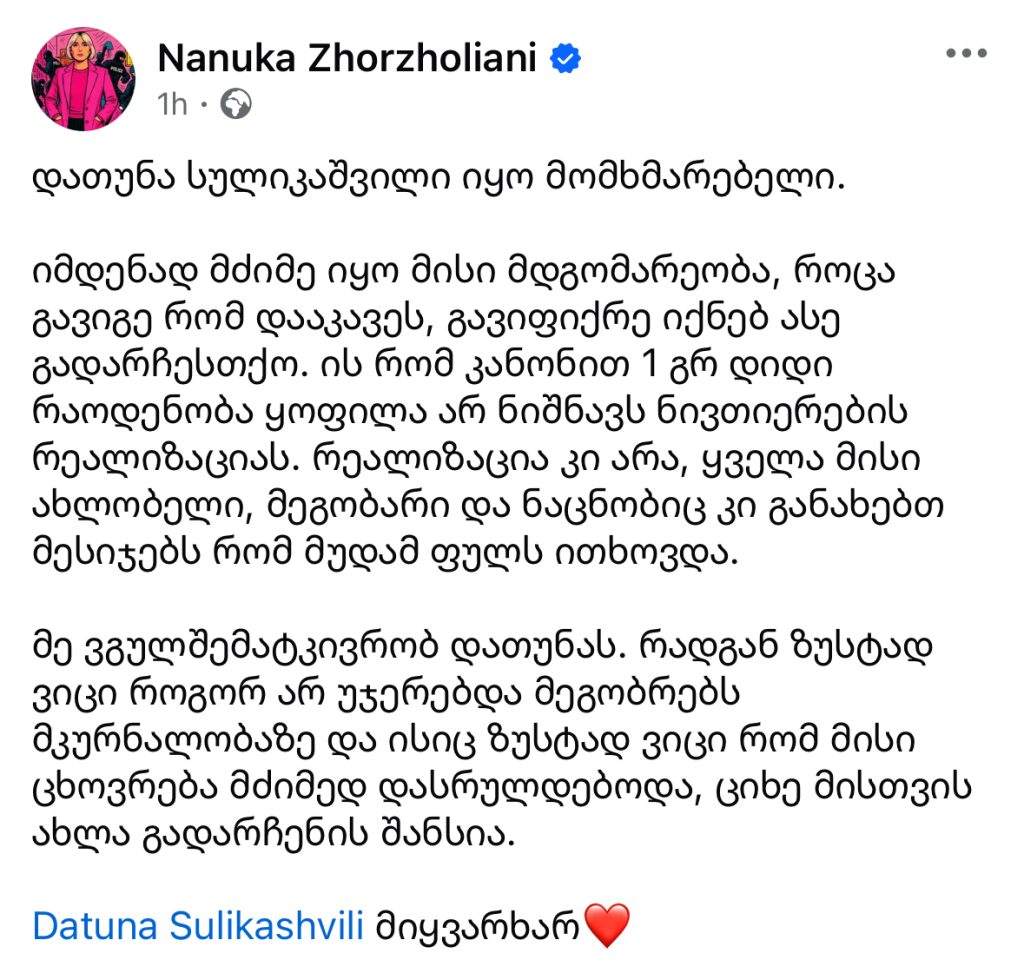 ნანუკა ჟორჟოლიანი დათუნა სულიკაშვილის დაკავებაზე წერს: