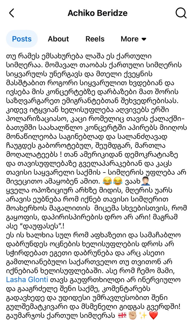 აჩიკო ბერიძე სოციალურ ქსელში პოსტს აქვეყნებს.