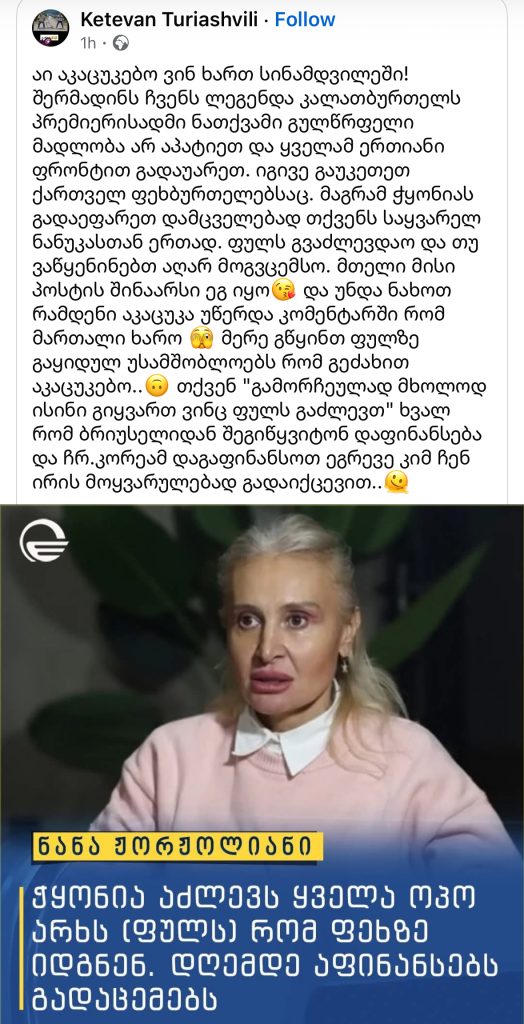 ”აი აკაცუკებო ვინ ხართ სინამდვილეში! შერმადინს ჩვენს ლეგენდა კალათბურთელს პრემიერისადმი ნათქვამი გულწრფელი მადლობა არ აპატიეთ და ყველამ ერთიანი ფრონტით გადაუარეთ. იგივე გაუკეთეთ ქართველ ფეხბურთელებსაც. მაგრამ ჭყონიას გადაეფარეთ დამცველებად თქვენს საყვარელ ნანუკასთან ერთად. ფულს გვაძლევდაო და თუ ვაწყენინებთ აღარ მოგვცემსო. მთელი მისი პოსტის შინაარსი ეგ იყო😘 და უნდა ნახოთ რამდენი აკაცუკა უწერდა კომენტარში რომ მართალი ხარო 🫣 მერე გწყინთ ფულზე გაყიდულ უსამშობლოებს რომ გეძახით აკაცუკებო..🙃 თქვენ “გამორჩეულად მხოლოდ ისინი გიყვართ ვინც ფულს გაძლევთ” ხვალ რომ ბრიუსელიდან შეგიწყვიტონ დაფინანსება და ჩრ.კორეამ დაგაფინანსოთ ეგრევე კიმ ჩენ ირის მოყვარულებად გადაიქცევით..🫠”