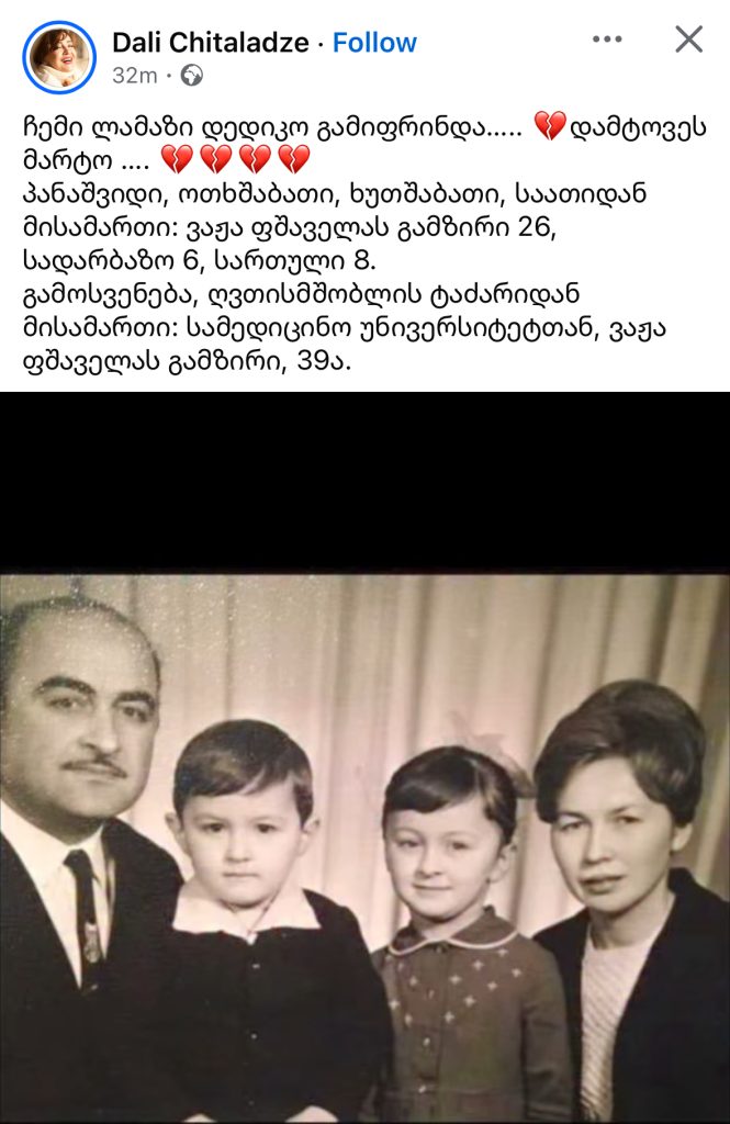 დალი ჩიტალაძე სოციალურ ქსელში სამწუხარო ინფორმაციას ავრცელებს.