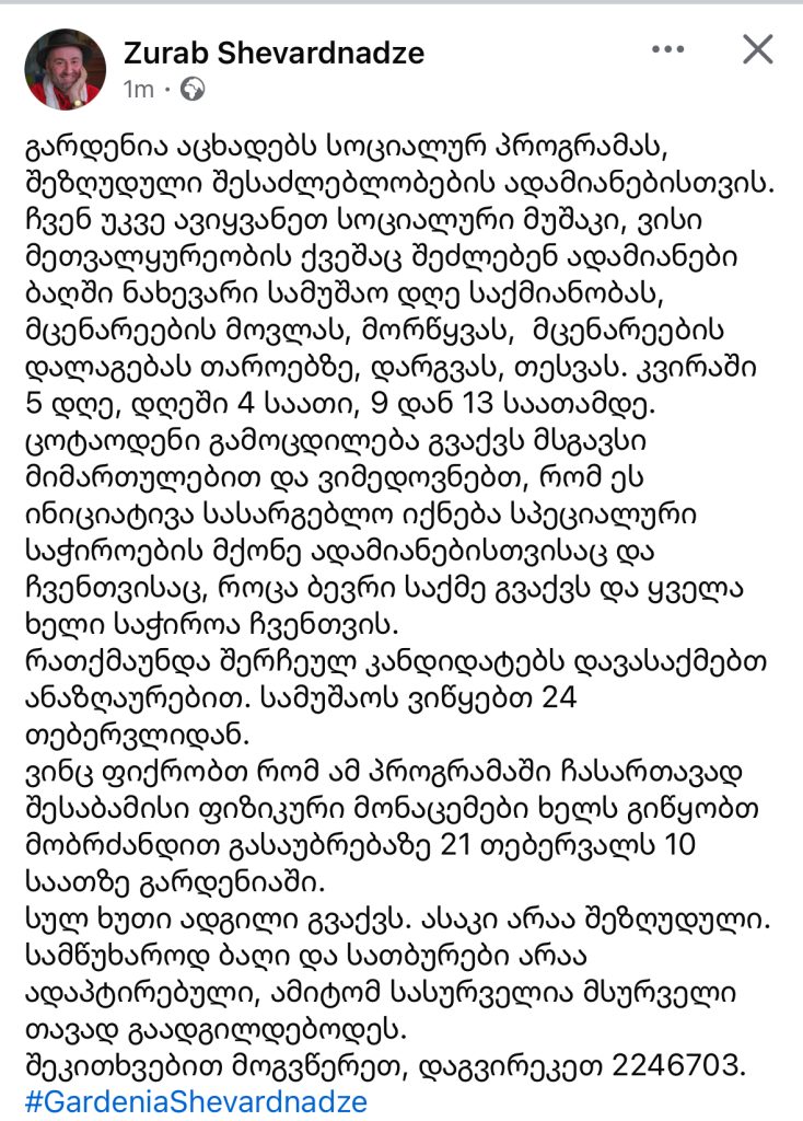 შეკითხვებით მოგვწერეთ, დაგვირეკეთ 2246703. #GardeniaShevardnadze”