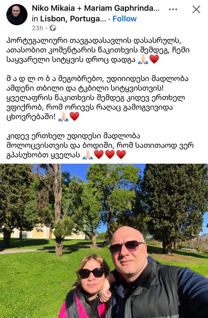 მარიამ გაფრინდაშვილის მეუღლე ნიკო მიქაია სოციალურ ქსელში პოსტს აქვეყნებს.