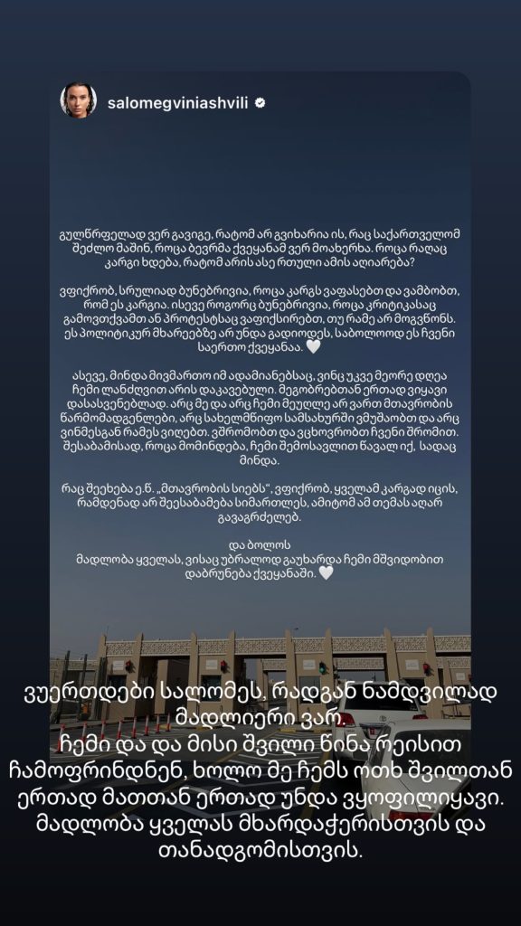 “ვუერთდები სალომეს, რადგან ნამდვილად მადლიერი ვარ. ჩემი და და მისი შვილი წინა რეისით ჩამოფრინდნენ, ხოლო მე, ჩემს ოთხ შვილთან ერთად, მათთან ერთად უნდა ვყოფილიყავი. მადლობა ყველას მხარდაჭერისა და თანადგომისთვის”, – დაწერა რუსა ჩაჩუამ.