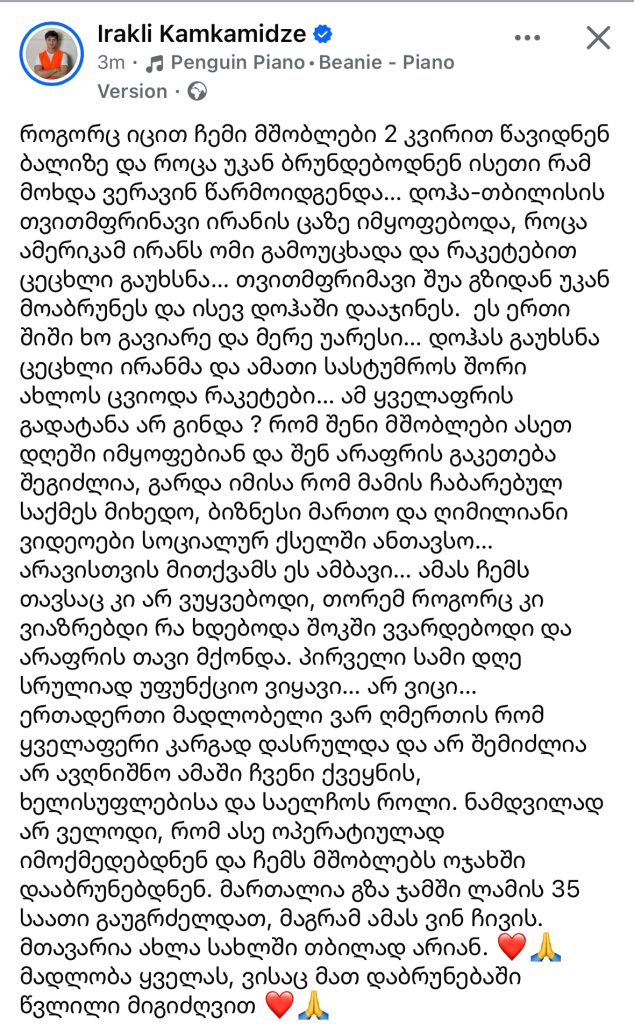 ”როგორც იცით ჩემი მშობლები 2 კვირით წავიდნენ ბალიზე და როცა უკან ბრუნდებოდნენ ისეთი რამ მოხდა ვერავინ წარმოიდგენდა… დოჰა-თბილისის თვითმფრინავი ირანის ცაზე იმყოფებოდა, როცა ამერიკამ ირანს ომი გამოუცხადა და რაკეტებით ცეცხლი გაუხსნა… თვითმფრიმავი შუა გზიდან უკან მოაბრუნეს და ისევ დოჰაში დააჯინეს. ეს ერთი შიში ხო გავიარე და მერე უარესი… დოჰას გაუხსნა ცეცხლი ირანმა და ამათი სასტუმროს შორი ახლოს ცვიოდა რაკეტები… ამ ყველაფრის გადატანა არ გინდა ? რომ შენი მშობლები ასეთ დღეში იმყოფებიან და შენ არაფრის გაკეთება შეგიძლია, გარდა იმისა რომ მამის ჩაბარებულ საქმეს მიხედო, ბიზნესი მართო და ღიმილიანი ვიდეოები სოციალურ ქსელში ანთავსო… არავისთვის მითქვამს ეს ამბავი… ამას ჩემს თავსაც კი არ ვუყვებოდი, თორემ როგორც კი ვიაზრებდი რა ხდებოდა შოკში ვვარდებოდი და არაფრის თავი მქონდა. პირველი სამი დღე სრულიად უფუნქციო ვიყავი… არ ვიცი… ერთადერთი მადლობელი ვარ ღმერთის რომ ყველაფერი კარგად დასრულდა და არ შემიძლია არ ავღნიშნო ამაში ჩვენი ქვეყნის, ხელისუფლებისა და საელჩოს როლი. ნამდვილად არ ველოდი, რომ ასე ოპერატიულად იმოქმედებდნენ და ჩემს მშობლებს ოჯახში დააბრუნებდნენ. მართალია გზა ჯამში ლამის 35 საათი გაუგრძელდათ, მაგრამ ამას ვინ ჩივის. მთავარია ახლა სახლში თბილად არიან. ❤️🙏 მადლობა ყველას, ვისაც მათ დაბრუნებაში წვლილი მიგიძღვით ❤️🙏”
