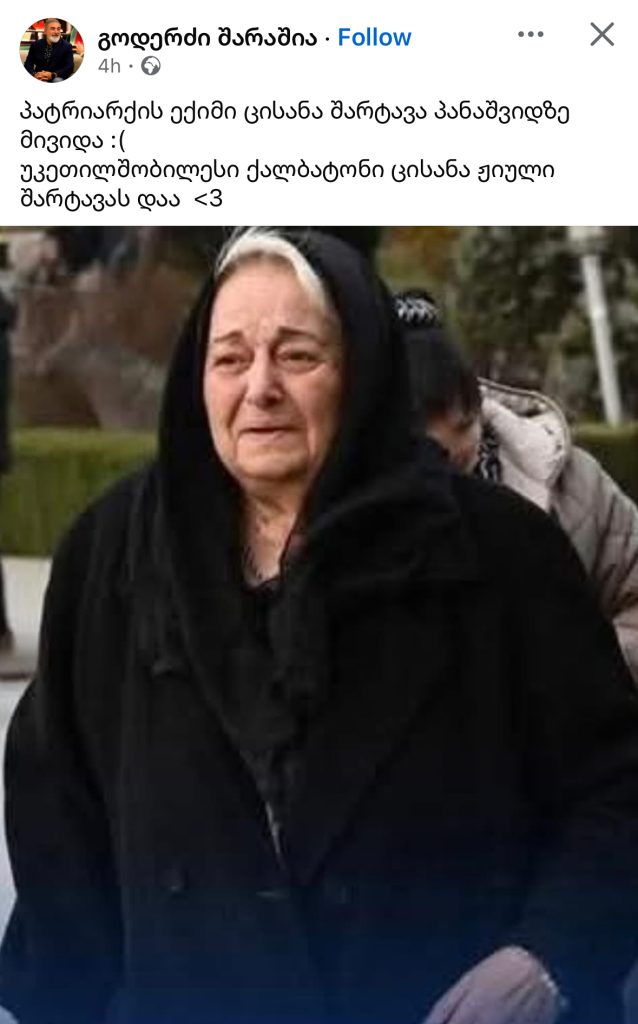 ”პატრიარქის ექიმი ცისანა შარტავა პანაშვიდზე მივიდა“ სლაიდერისოც.ქსელები By editor გამოქვეყნდა 20.03.2026 5 გაზიარება გოდერძი შარაშია სოციალურ ქსელში პოსტს აქვეყნებს. ”პატრიარქის ექიმი ცისანა შარტავა პანაშვიდზე მივიდა 🙁 უკეთილშობილესი ქალბატონი ცისანა ჟიული შარტავას დაა <3” 5 გაზიარება
