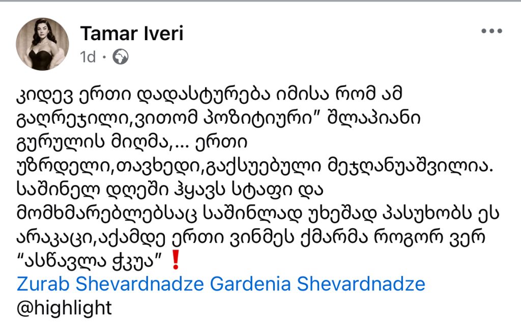 თამარ ივერი სოციალურ ქსელში ზურაბ შევარდნაძის გარშემო განვითარებულ სკანდალს ეხმაურება.