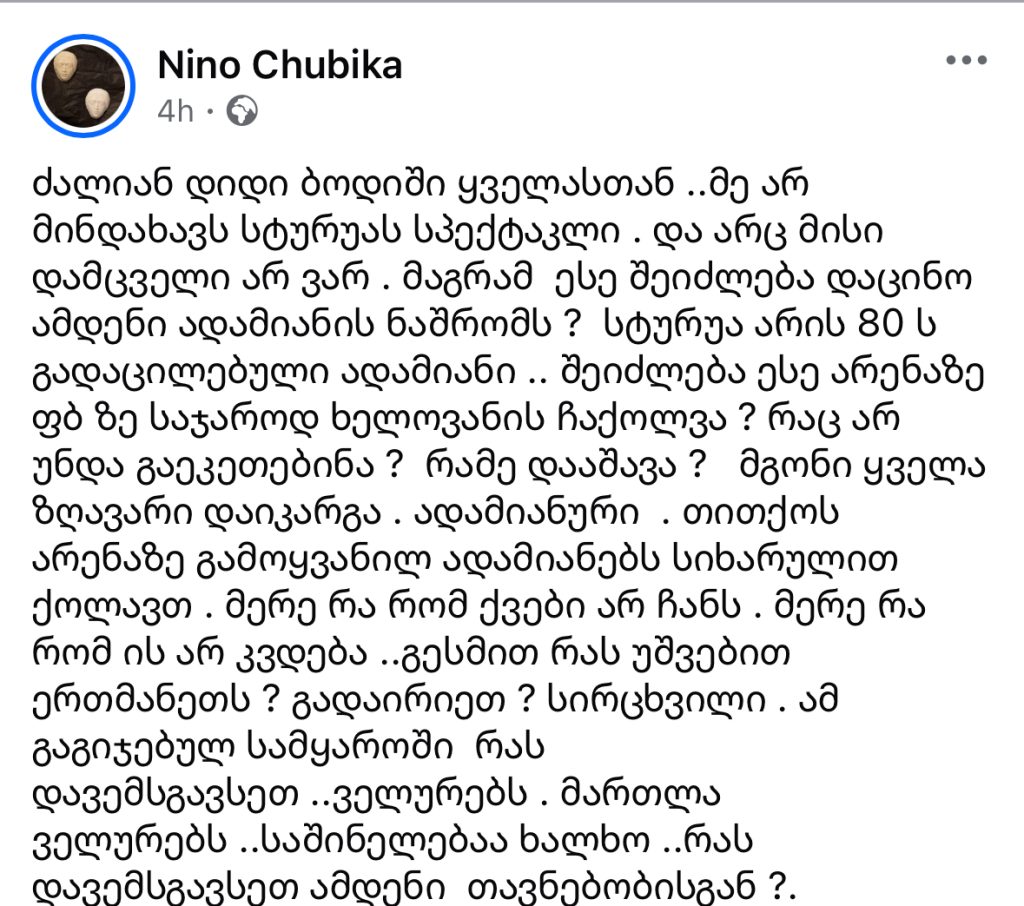 ”ძალიან დიდი ბოდიში ყველასთან ..მე არ მინდახავს სტურუას სპექტაკლი და არც მისი დამცველი არ ვარ. მაგრამ ესე შეიძლება დაცინო ამდენი ადამიანის ნაშრომს ? სტურუა არის 80 ს გადაცილებული ადამიანი .. შეიძლება ესე არენაზე ფბ ზე საჯაროდ ხელოვანის ჩაქოლვა? რაც არ უნდა გაეკეთებინა? რამე დააშავა? მგონი ყველა ზღვარი დაიკარგა ადამიანური. თითქოს არენაზე გამოყვანილ ადამიანებს სიხარულით ქოლავთ. მერე რა რომ ქვები არ ჩანს. მერე რა რომ ის არ კვდება ..გესმით რას უშვებით ერთმანეთს ? გადაირიეთ ? სირცხვილი. ამ გაგიჟებულ სამყაროში რას დავემსგავსეთ ..ველურებს. მართლა ველურებს…საშინელებაა ხალხო ..რას დავემსგავსეთ ამდენი თავნებობისგან ?.”