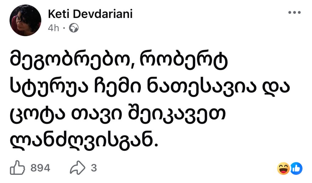 “რობერტ სტურუა ჩემი ნათესავია და ცოტა თავი შეიკავეთ ლანძღვისგან” სლაიდერისოც.ქსელები By editor გამოქვეყნდა 08.04.2026 31 გაზიარება ქეთი დევდარიანი სოციალურ ქსელში წერს: მეგობრებო, რობერტ სტურუა ჩემი ნათესავია და ცოტა თავი შეიკავეთ ლანძღვისგან. 31 გაზიარება