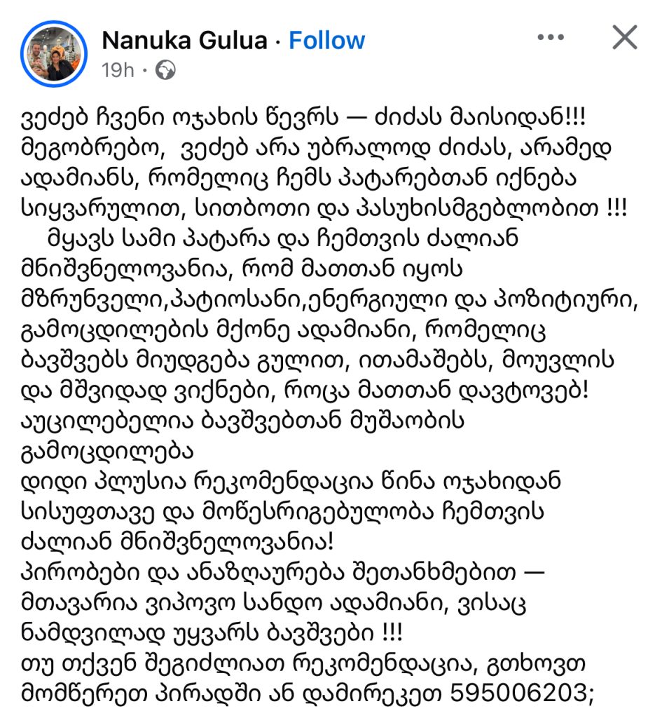 მეგობრებო, ვეძებ არა უბრალოდ ძიძას, არამედ ადამიანს, რომელიც ჩემს პატარებთან იქნება სიყვარულით, სითბოთი და პასუხისმგებლობით !!!