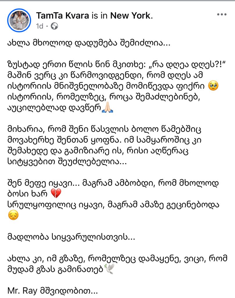 მიხარია, რომ შენი წასვლის ბოლო წამებშიც მოვახერხე შენთან ყოფნა. იმ სამყაროშიც კი შემახედე და გამიზიარე ის, რისი აღწერაც სიტყვებით შეუძლებელია…