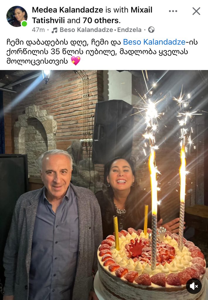 როგორ აღნიშნა ბესო კალანდაძემ ქორწინების 35 წლისთავი სლაიდერისოც.ქსელები By editor გამოქვეყნდა 26.04.2026 36 გაზიარება ბესო კალანდაძის ცოლი მედეა კალანდაძე სოციალურ ქსელში პოსტს აქვეყნებს. ”ჩემი დაბადების დღე, ჩემი და Beso Kalandadze-ის ქორწილის 35 წლის იუბილე, მადლობა ყველას მოლოცვისთვის 💖”-წერს მომღერლის მეუღლე. 36 გაზიარება